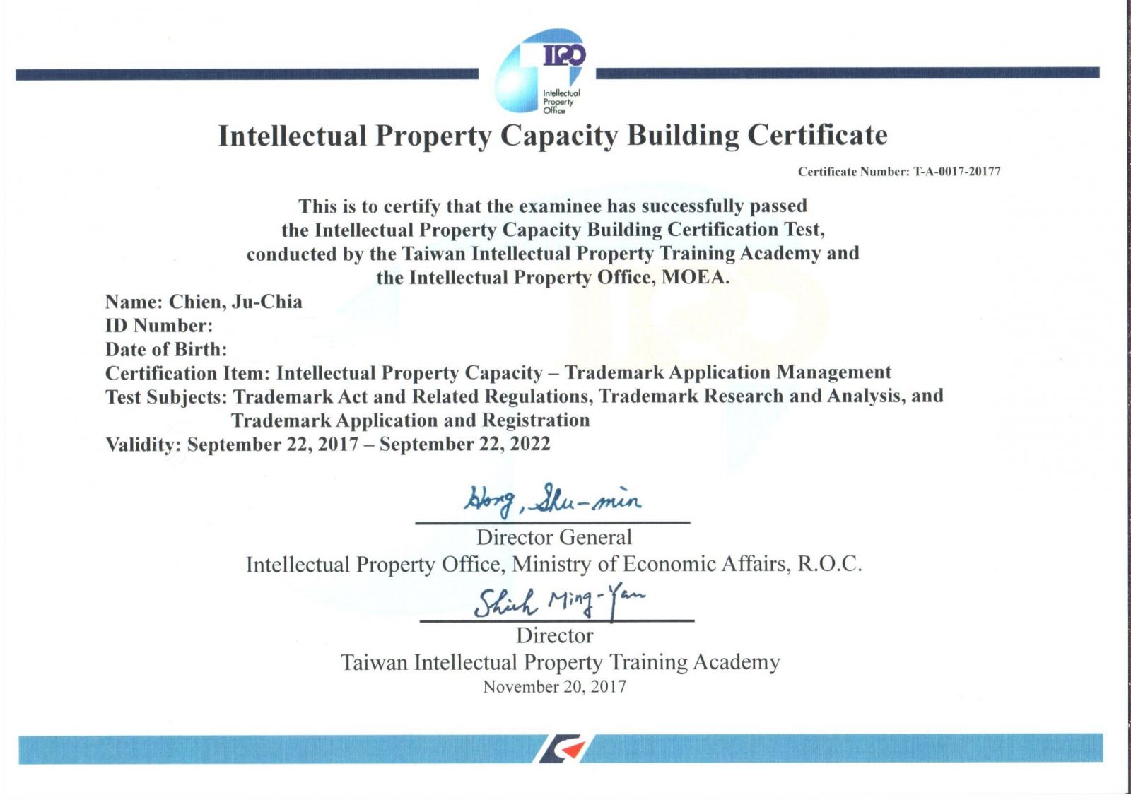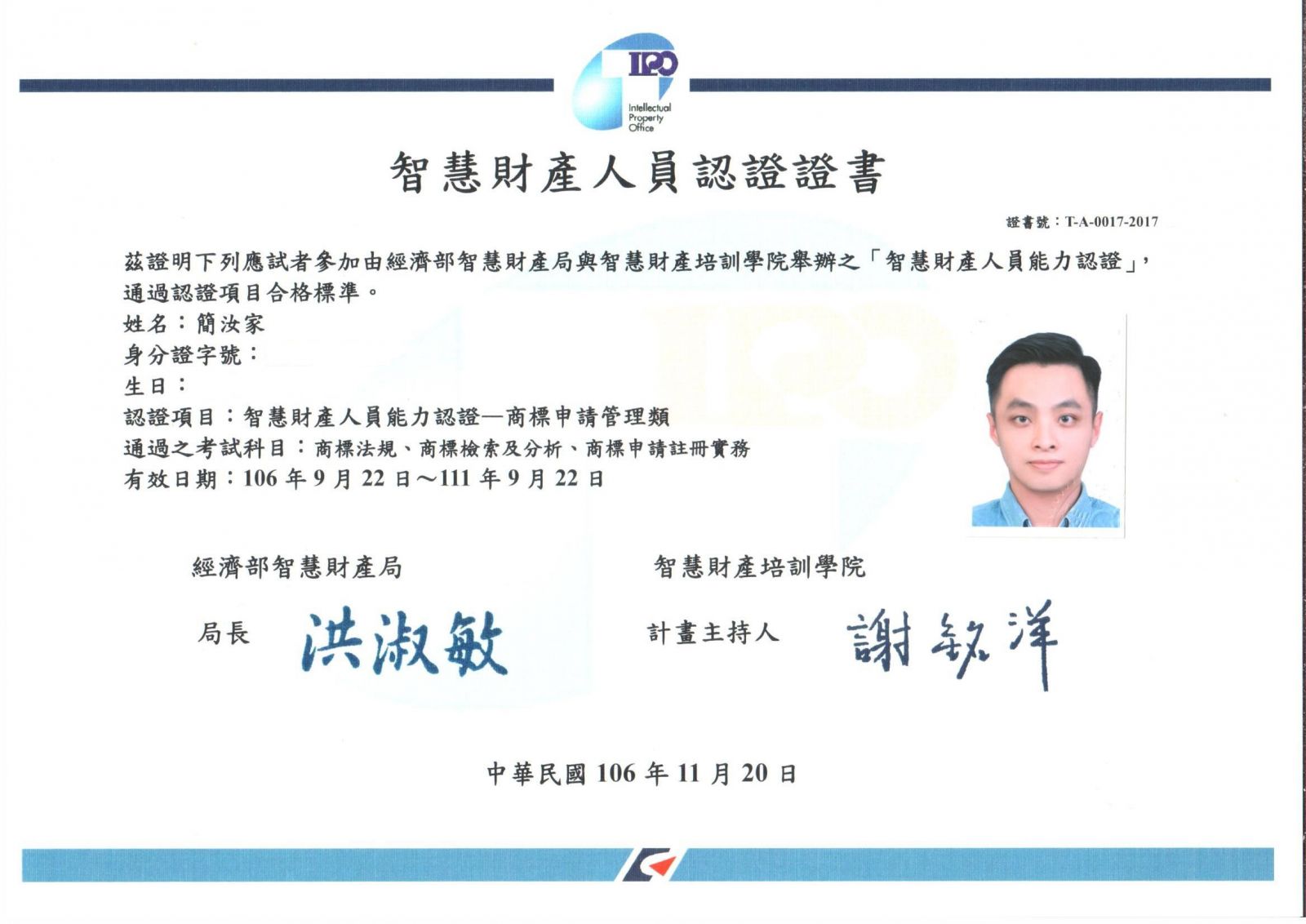 恭賀本所簡汝家商標代理人通過106年度智慧財產人員能力認證考試(商標申請管理類)